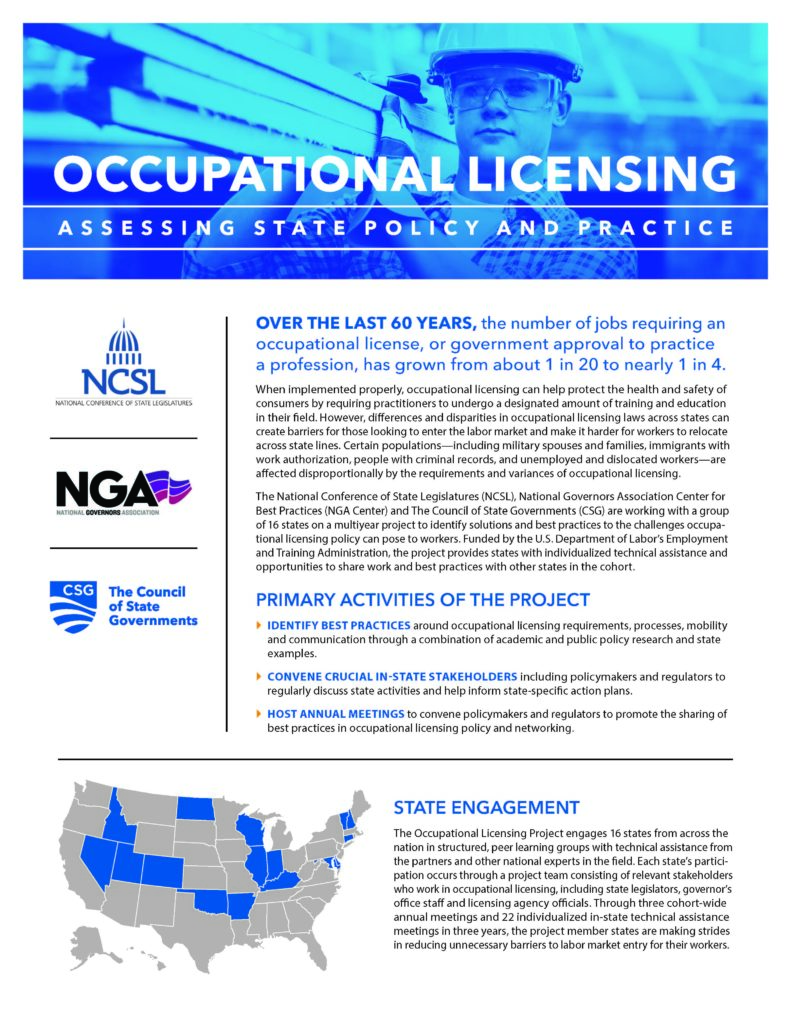 In recent years, state policymakers have used two mechanisms to enable interstate mobility of licensed professionals. Interstate licensure compacts are statutorily enacted agreements among states to allow professionals to work across state lines. Universal licensure recognition laws are enacted by a single state to grant a license by endorsement to a practitioner from another state. […]